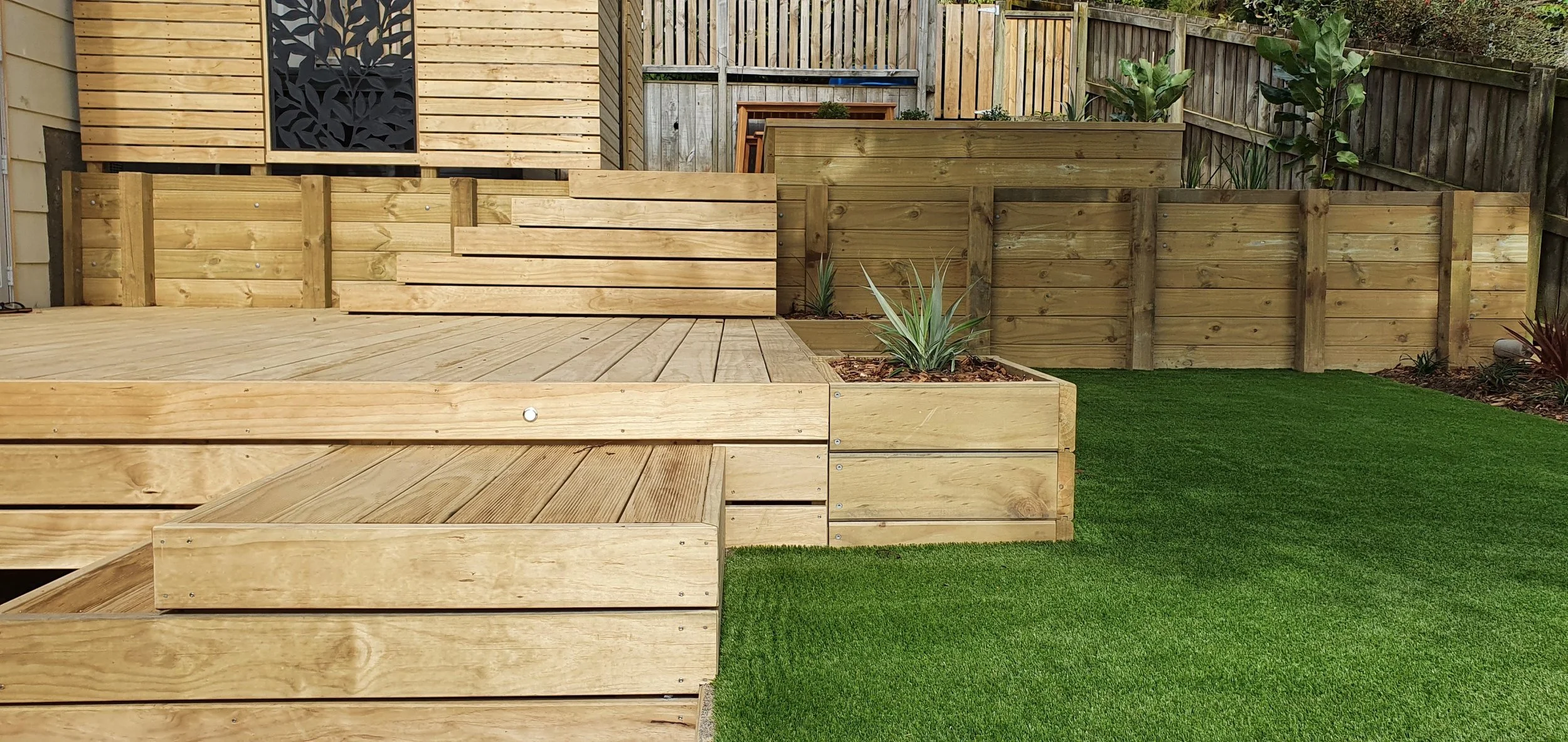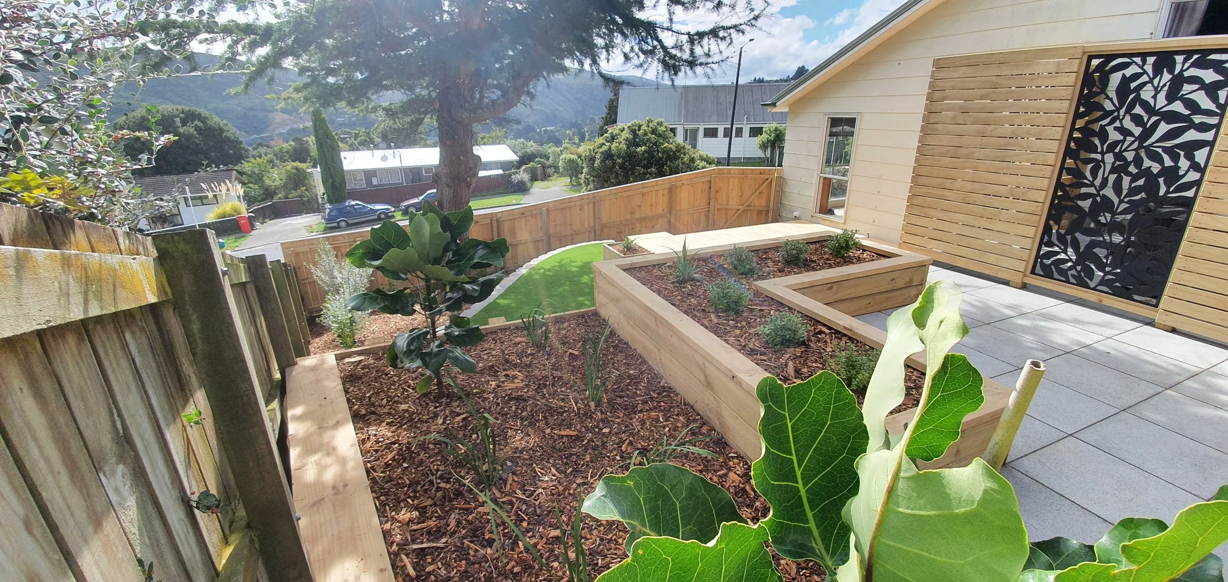 This Stokes Valley property, one of our early 2022 projects, came with the challenge of a steep and difficult section beside the house. We used the natural lay of the land to guide the design, building a new deck, retaining wall, planter boxes, fencing, and screens around a spa area. Paving and stairs were added to connect the upper levels, while the lower area was redefined with Firth keystone blocks, fresh planting, and a new artificial lawn. What was once an overgrown, unusable site has been transformed into a relaxed, multi-functional outdoor space.
