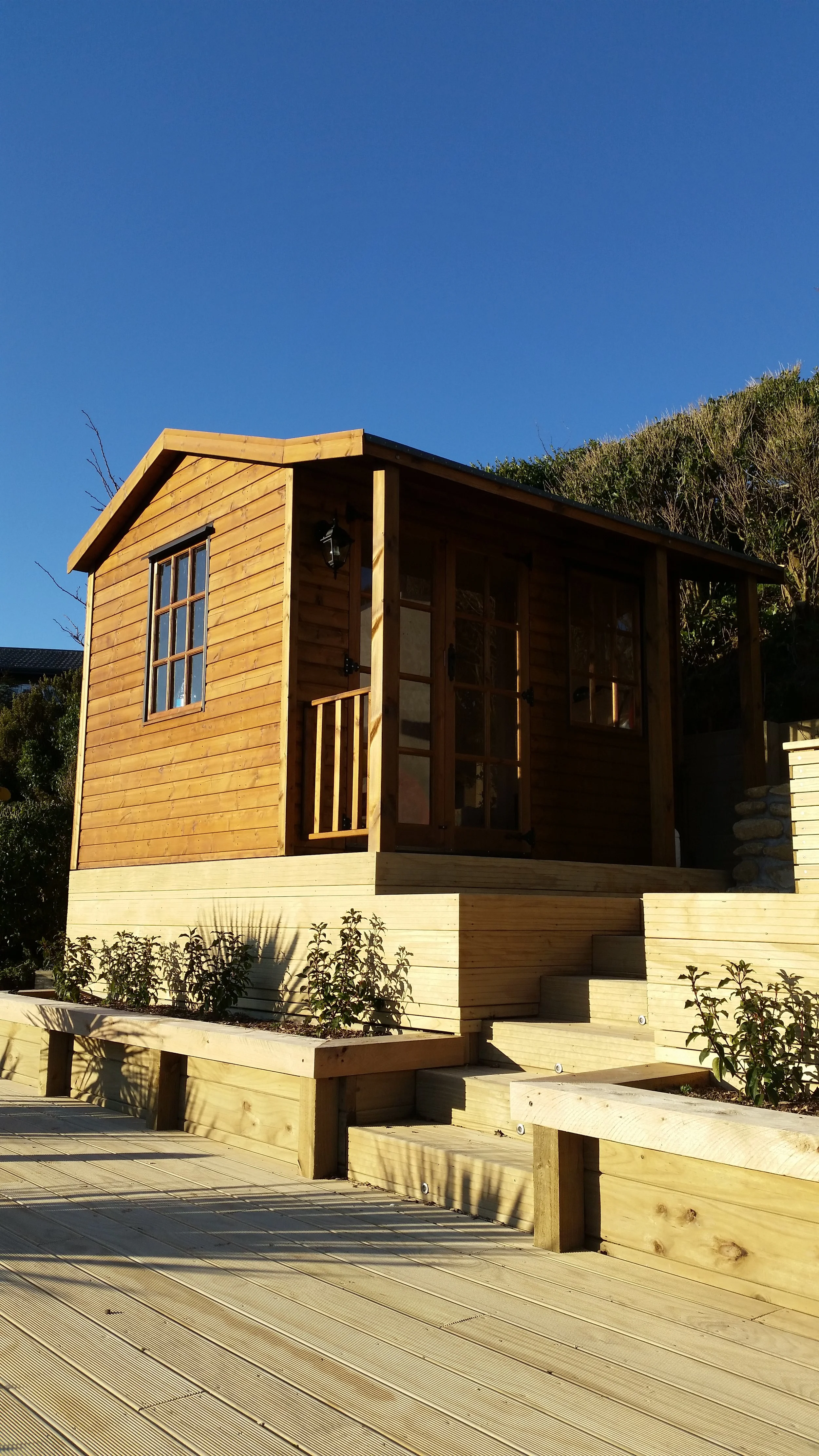 We cleared the site and, working with the steep terrain, constructed a retaining wall and two split-level decks. On the upper level, we built and finished a Sheshed kitset cabin, lining it with insulation and plywood, and adding bespoke pipe shelving and a fold-down desk for functionality. Just outside the cabin, a deck with built-in seating and storage was designed around a striking outdoor fireplace.