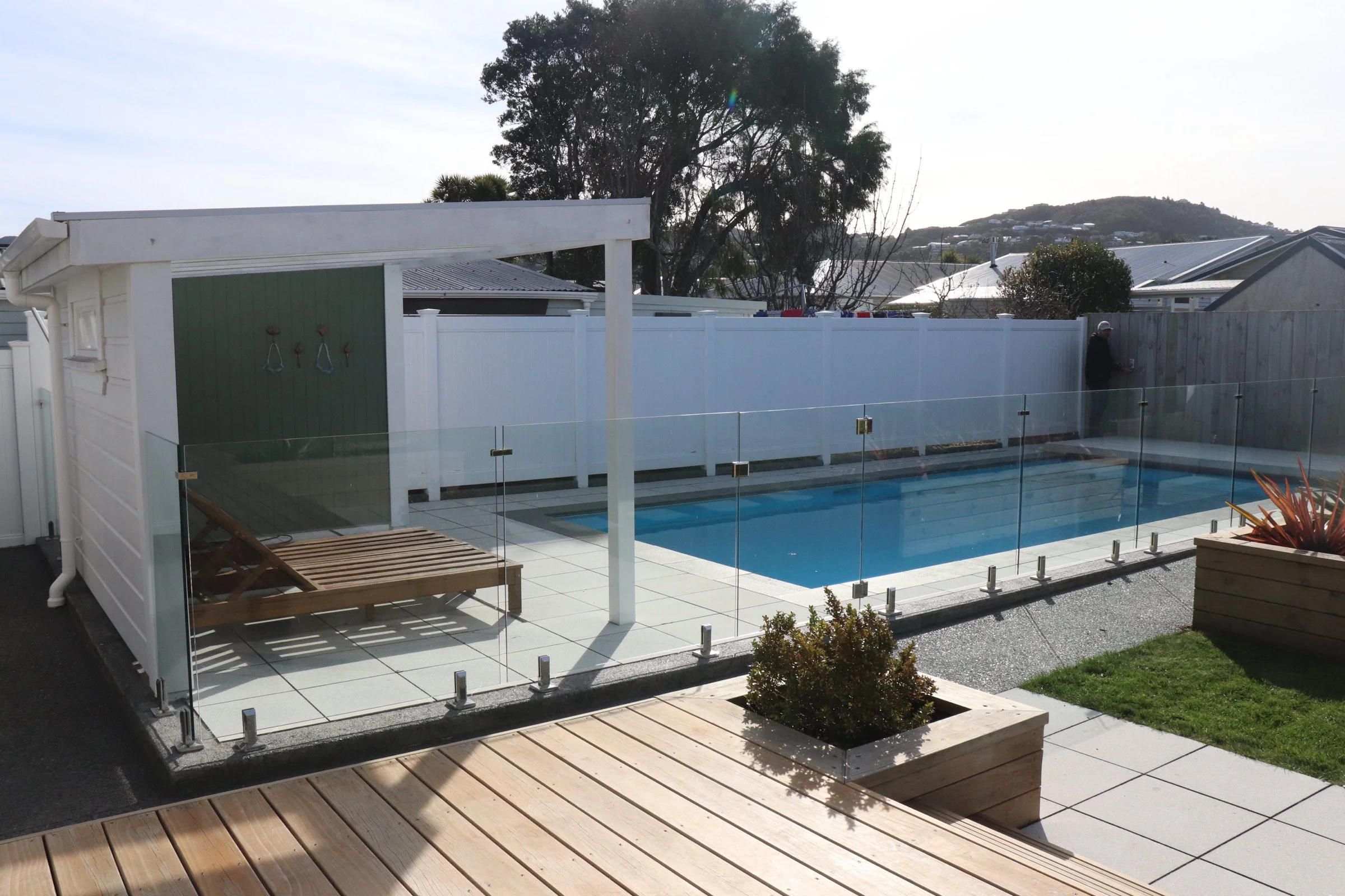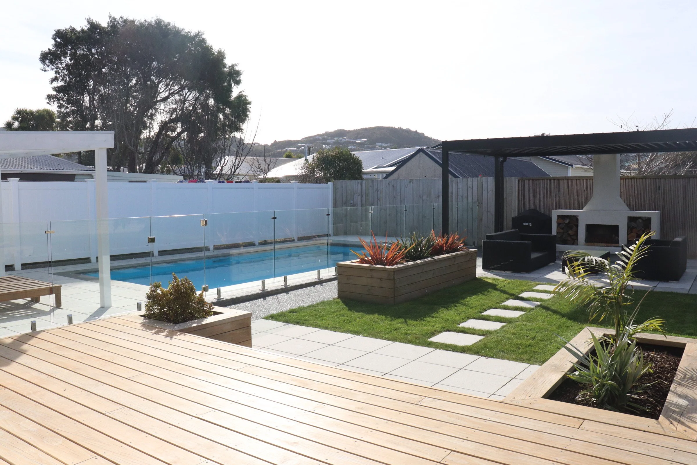 The Petone clients wanted a modern outdoor space with a new pool that could be enjoyed year-round by both teenagers and adults. To make room, the rear garage was removed and replaced with a pool surrounded by fresh paving. Groundbreakers Landscaping then built a pool house featuring an outdoor shower, a new south-facing window, and a clear polycarbonate roof to let in natural light.